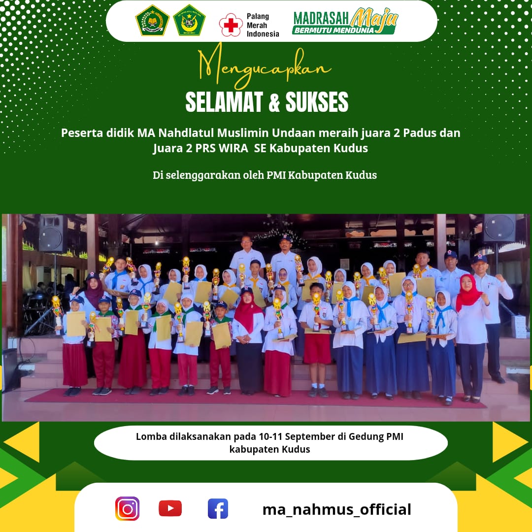 MA Nahdlatul Muslimin kembali mengukir prestasi gemilang dalam ajang Lomba Kepalangmerahan yang diselenggarakan oleh Palang Merah Indonesia (PMI) Kabupaten Kudus, dalam rangka memperingati HUT PMI yang ke-79 dengan tema “Aksi Adaptasi Iklim.” Dari beberapa kategori lomba, MA Nahdlatul Muslimin berhasil meraih juara dalam dua cabang lomba, yaitu Juara 2 Lomba Pendidikan Remaja Sebaya (PRS) yang diraih oleh Finna Afidatul Munawaroh dan Juara 2 Lomba Paduan Suara yang dipersembahkan oleh tim paduan suara yang terdiri dari 11 siswa.